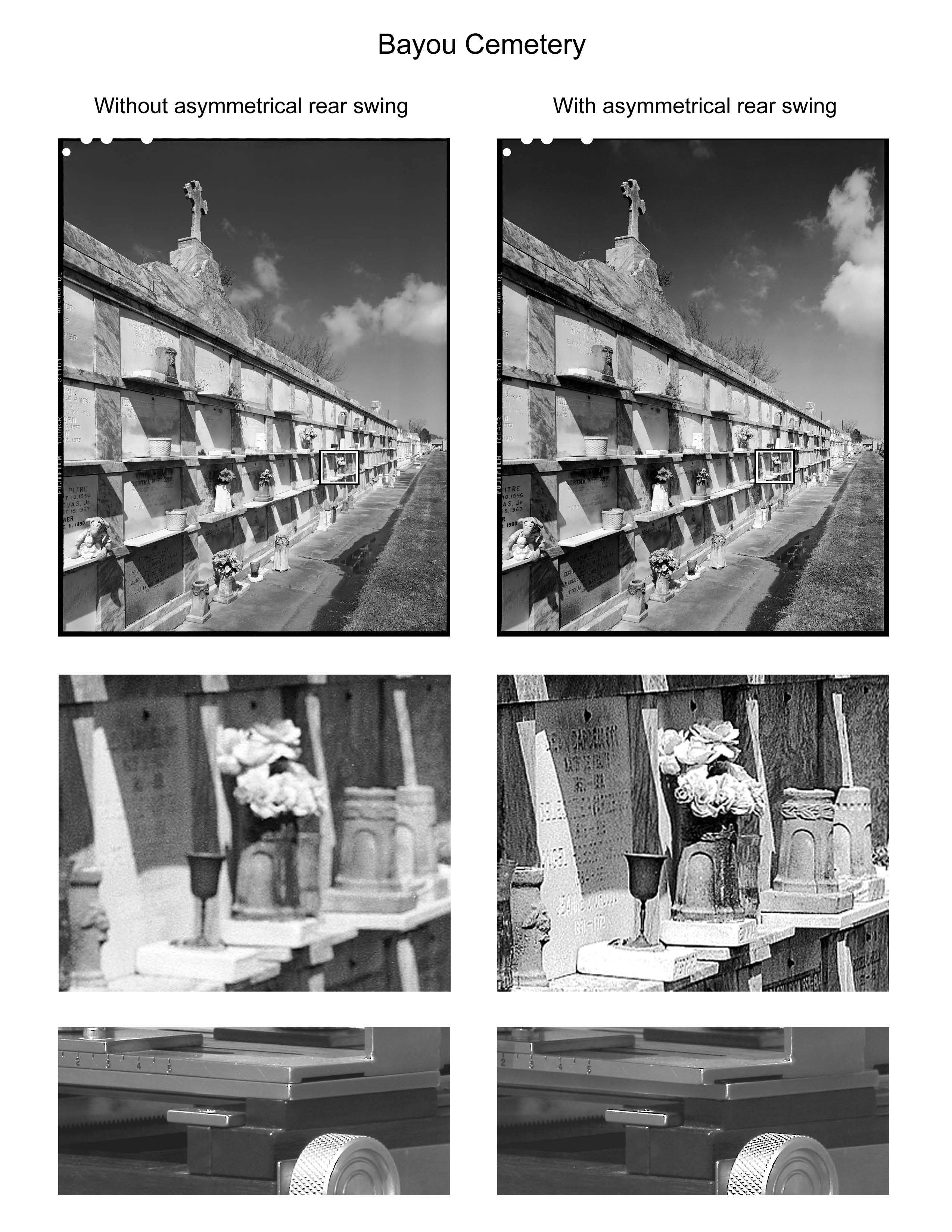 Following are some photographic examples where asymmetrical movements have been employed. These examples should make the concept of asymmetrical movements and their implementation very clear. The first two examples are from a famous New Orleans cemetery--St. Louis Cemetery No. 3, sometimes called the Bayou Cemetery, because of its proximity to Bayou St. John. This cemetery, like most others in New Orleans, is densely packed, and angled views of the long rows of tombs must be taken at close range to avoid obstructions. A depth-of-field from 4 feet (or less) from the camera virtually to infinity (in some cases) is required to render the subject in uniformly sharp focus. In the two photographs from St. Louis No. 3, identical apertures of f/11.5 were used. In one instance, no movement was applied. In the second instance, a swing was employed to extend the depth-of-field along the primary subject plane of the tomb facades. Once the movement has been applied, the depth-of-field is virtually infinite along the subject plane, in accordance with the Scheimpflug rule. In both instances, no guesswork is involved. The required amount of swing was implemented in a simple two-step focusing process using the lines on the focusing screen to establish the focal points.