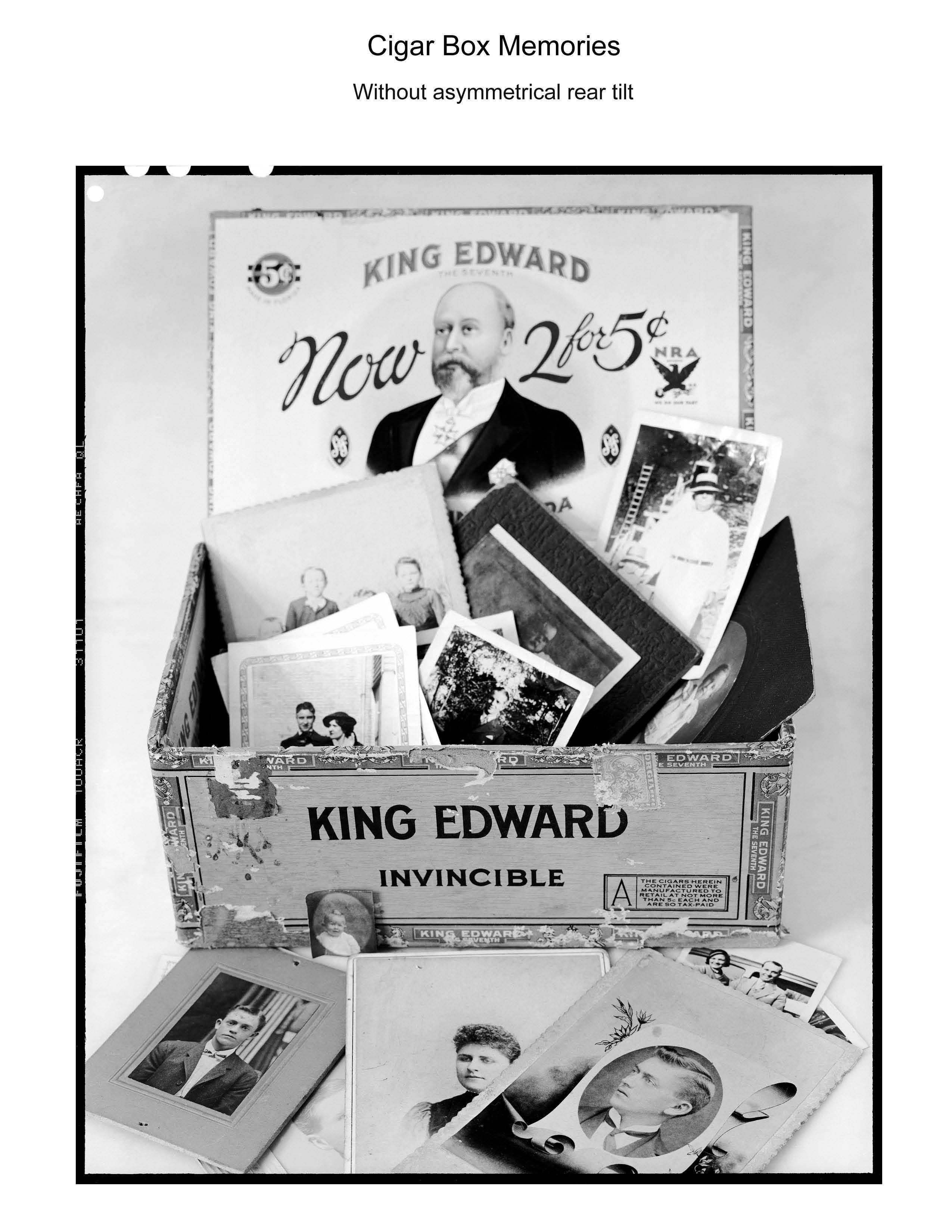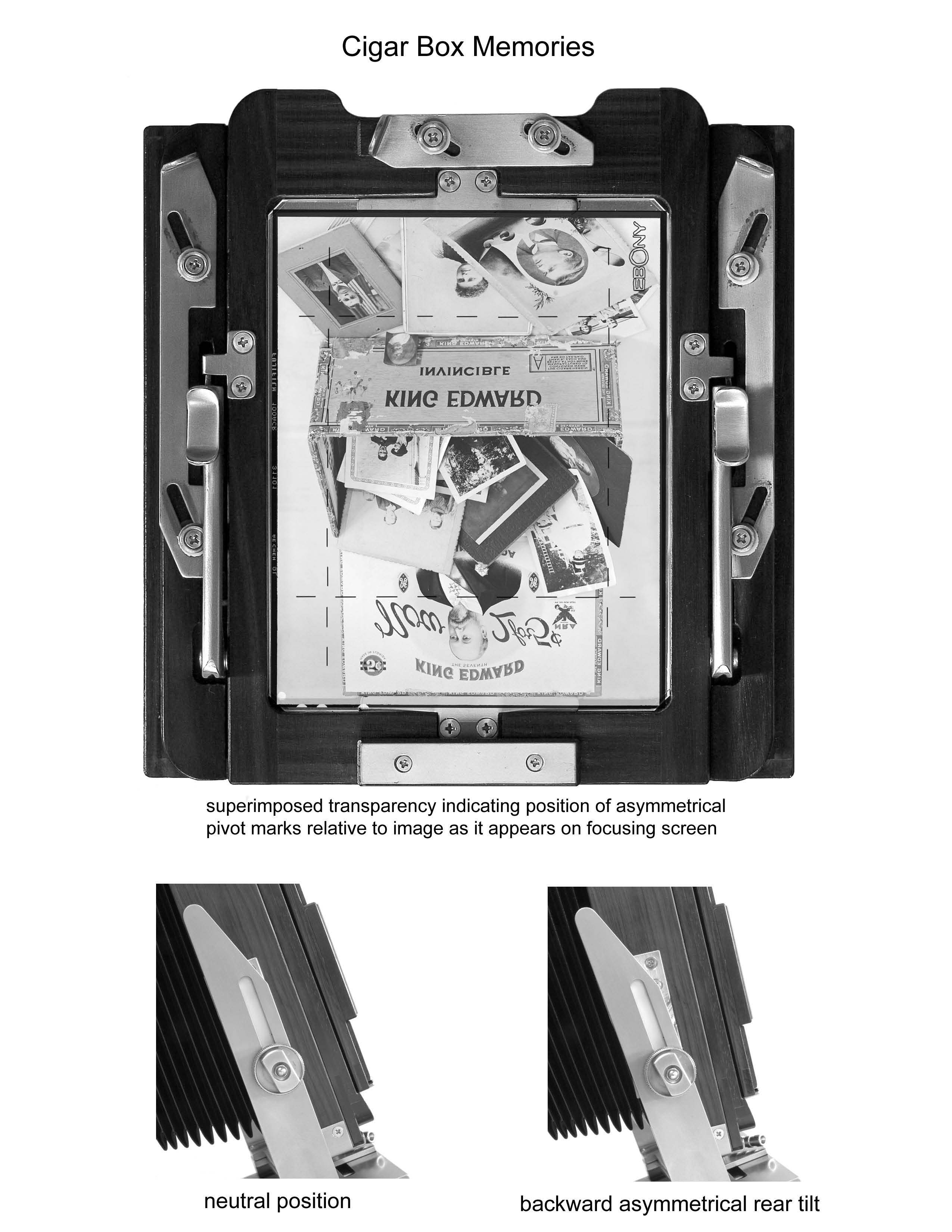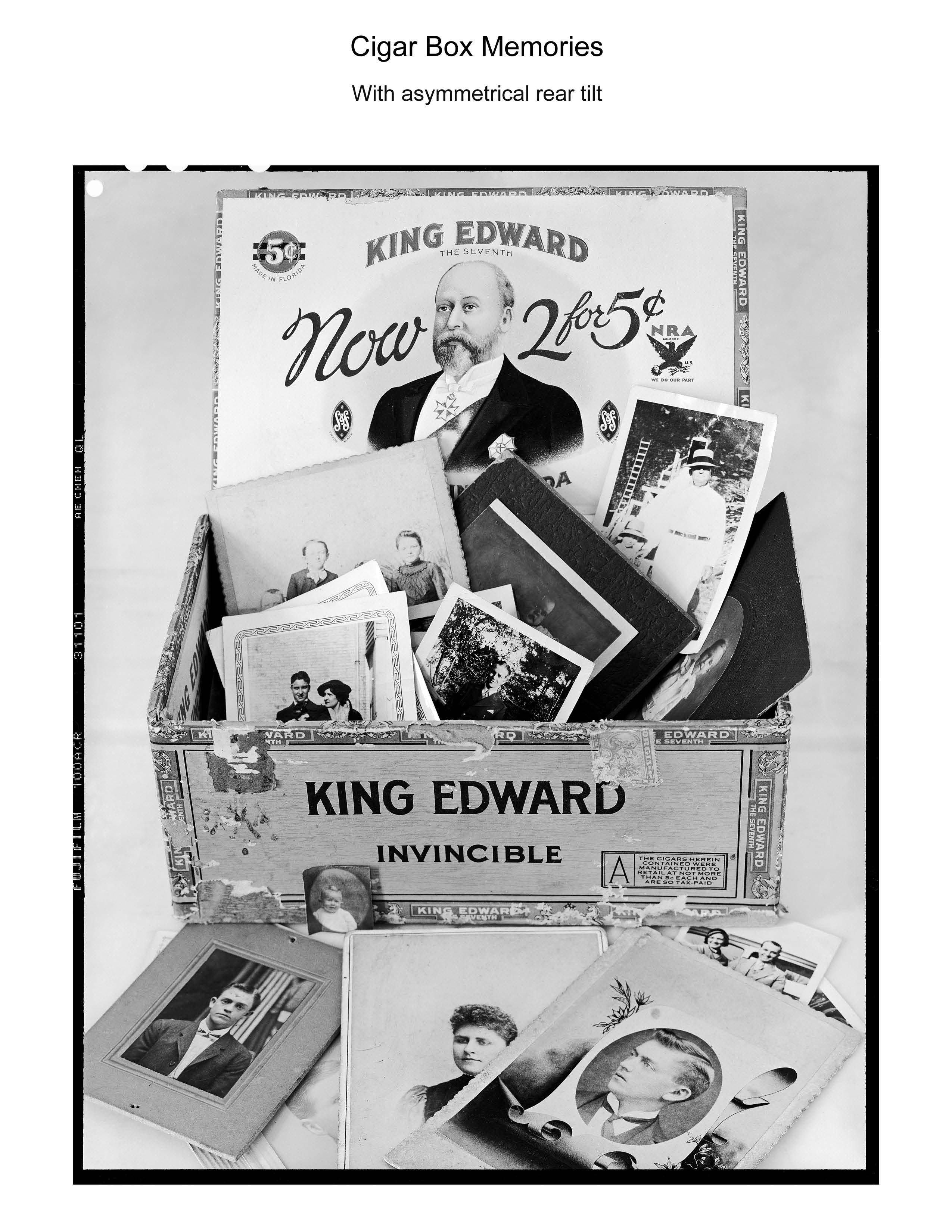 The second example is an arranged still life titled "Cigar Box Memories." The opened box, which was found in a storage chest, is photographed on a marble tabletop with its inventory of old family snapshots placed around it. The camera is angled down to the subject. In this case, a tilt has been applied to the rear standard to enhance the primary subject plane of the inside lid of the cigar box down to the table surface forward of the box. In still life photography, because focusing distances are relatively close and lens focal lengths tend to be longer than normal (200mm, in this case), camera movements to extend depth-of-field are usually required to keep the entire subject in focus. As in the first two examples, identical images with the same lens and aperture (f/16.5) were taken. The first was taken with no movement employed, and the second with the necessary movement to extend depth-of-field so that the entire subject is in focus. As with the first two examples, a simple two-step focusing process quickly and easily established the degree of movement needed.