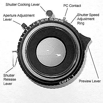 The most important controls are the lever to adjust the aperture blades, the ring to set the shutter speed, the lever to release the shutter, and the preview lever that opens the shutter blades so you can preview and focus the image. (Note that Fujinon large format lenses are mounted on a slightly different version of the Copal shutter shown below. Fujinon Copal shutters do not have the aperture adjustment lever on the top of the lens. Instead the lever is on the bottom, and looks like a smaller version of the round shutter cocking lever.) Another control provides a PC contact that enables you to trigger a flash. These controls are all shown in another view of the same lens: