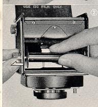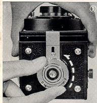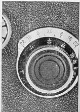 At the focusing knob is a scale which will indicate the Depth-of-Field when the camera is focused at various distances. You will notice that an either side of the f 3.5 figure is a similar set of numbers which represent lens apertures. When the camera is fecund on your subject look for the aperture you are using on either side of the scale to determine the Depth-of-Field. Thus, if the camera is focused at 10 feet and the lens aperture is f :8 the Depth-of-Field Area in which all objects are sharp) s from about 8 ft. to 13 ft. |