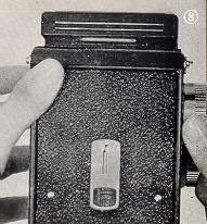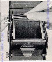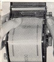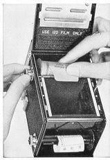 (2) Remove the Take-Up Spool in the Lower Film Chamber by pulling out the Lower Film Spool Locking Spring. (3) Place the Take-Up Spool in the Upper Film Chamber by pulling out the Upper Film Spool Locking Spring. (4) Place a new roll of size 120 film in the Lower Film Chamber. | |