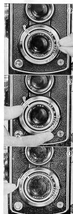 (1) Open the Viewfinder Hood by lifting it at back. Press the Viewfinder Hood down to close it. (2) Set the Lens Aperture Control Lever to the desired number on the Lens Aperture Scale. (3) Set the Shutter Speed Dial on the required speed to the Shutter Speed Indicator. (4) Push down the Shutter Cocking Lever. Be sure not to change Shutter Speed after the shutter is cocked. |