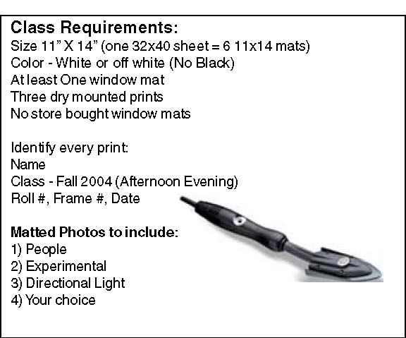 There are many types and grades of mounting board based on archival properties, thickness, surface texture and color. White or off white board is most common for photographs and are the only colors that should be used in this class.