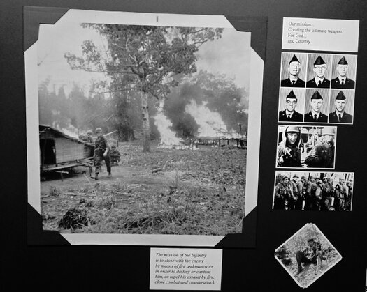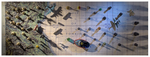 In Vietnam we were told we were saving Australia and the world from communism. One country after another, action and reaction. Artifacts of chance and traps superimposed over a map of Vietnam. Ration card indicating I bought my first 35mm camera.