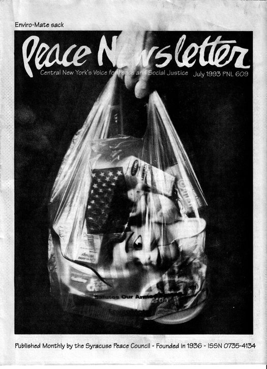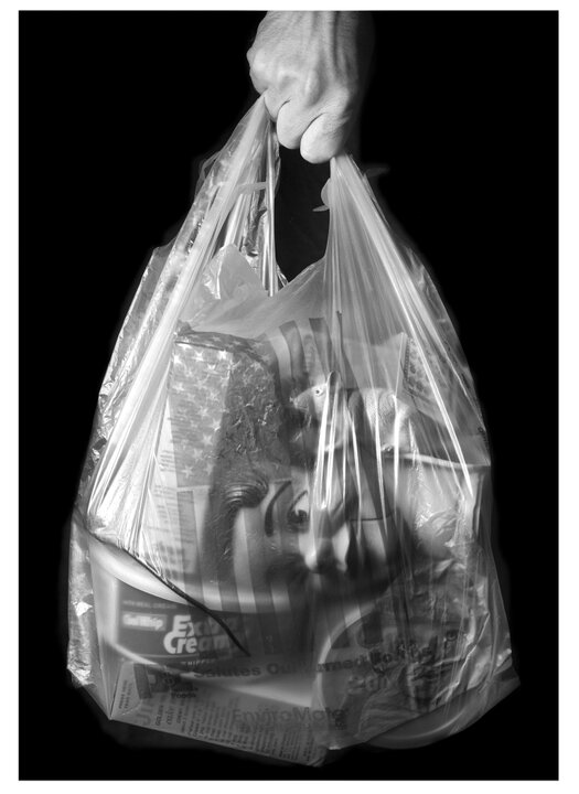 Paper or Plastic series: First Gulf war – American flag printed on a plastic bag made from oil declaring P&C salutes our Armed Forces.