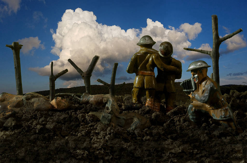 Shooting set - model stage Model with toy soldiers 8X10X20 2020 "Toy soldiers date back to the time of the Pharaohs. As a young boy I made lead soldiers with an A.C. Gilbert set. Between WWI and WWII the Manoil and Barclay companies were the primary producers of toy soldiers. This was the period following the bloody ""war to end all wars."" I discovered they had wounded and medical soldiers. II tried to imagine what it must have been like for children who were aware of the horrors of war to ""play"" with victims of battle. The soldiers I made and played with were never wounded.